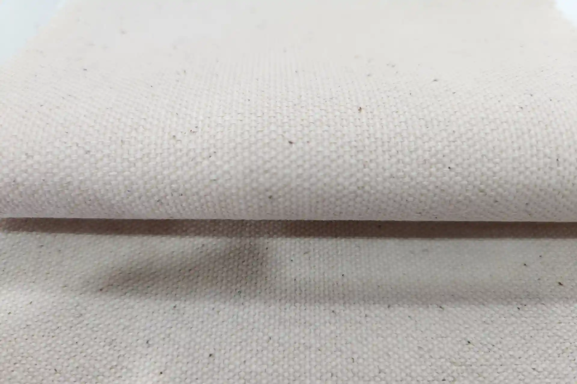 Our 10 Oz Cotton canvas Fabric, also referred to as 310 GSM Duck Fabric, is crafted from 100% cotton for premium quality. The 10 Oz Cotton duck canvas fabric is most used cotton canvas fabric for Tote bags, weighing approximately 10 Oz/sq yd, 310 gsm duck fabric. The 10 Oz duck fabric is made using 10s OE x 6s OE available in various widths in both Roll packing and bale packing (fold). This fabric is made using 10s/6s oe yarn in natural cotton color in a Oxford weave. It is available in various widths starting from 36″ (91 cm) to 120″ (304 cm) in customized packing of rolls and bales (fold). Color options include off-white, beige, or natural.